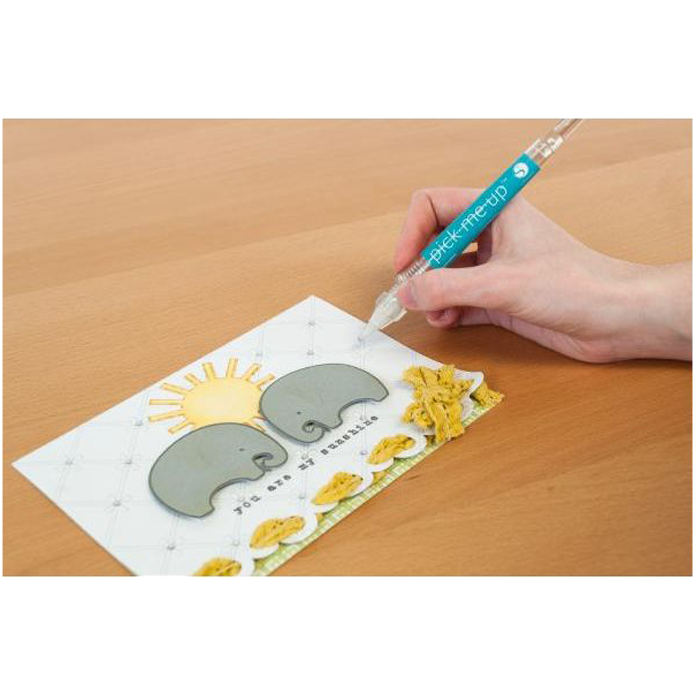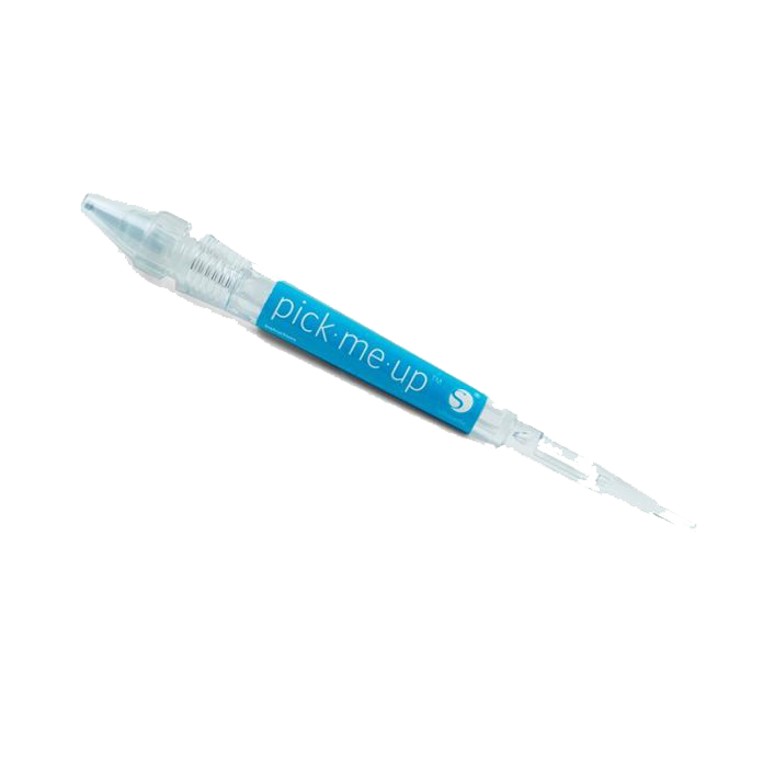 The Pick-Me-Up® tool has a tacky tip for picking up and placing small objects, like paper pieces and rhinestones. The tool tip can be twisted to expose further sticky tack material as it begins to wear down. It also has a removable stylus on the back of the tool so that you can press small paper pieces into place to help release them from the tool's tacky grip.